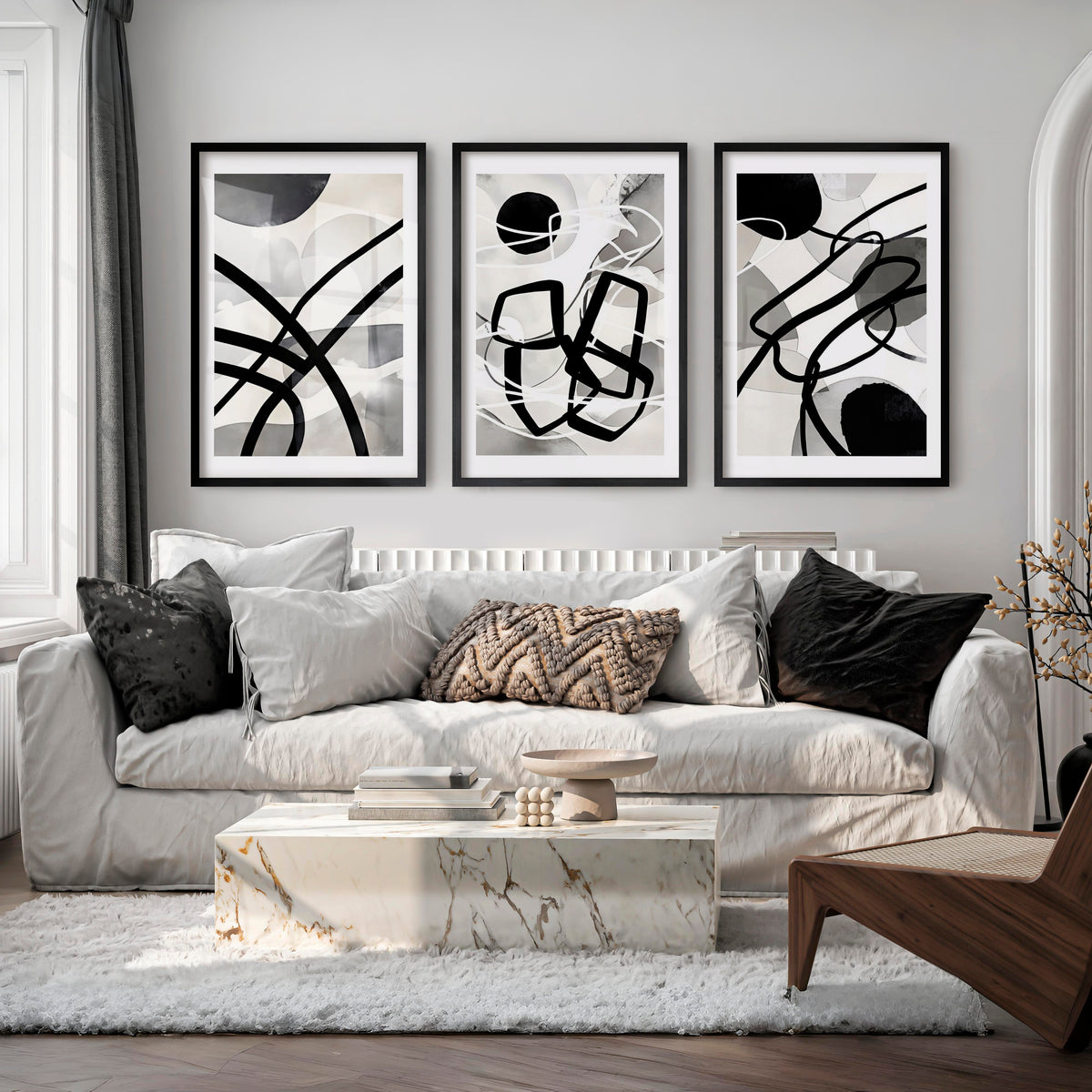 Wall Art Abstract Framed Black White Modern Set of 3