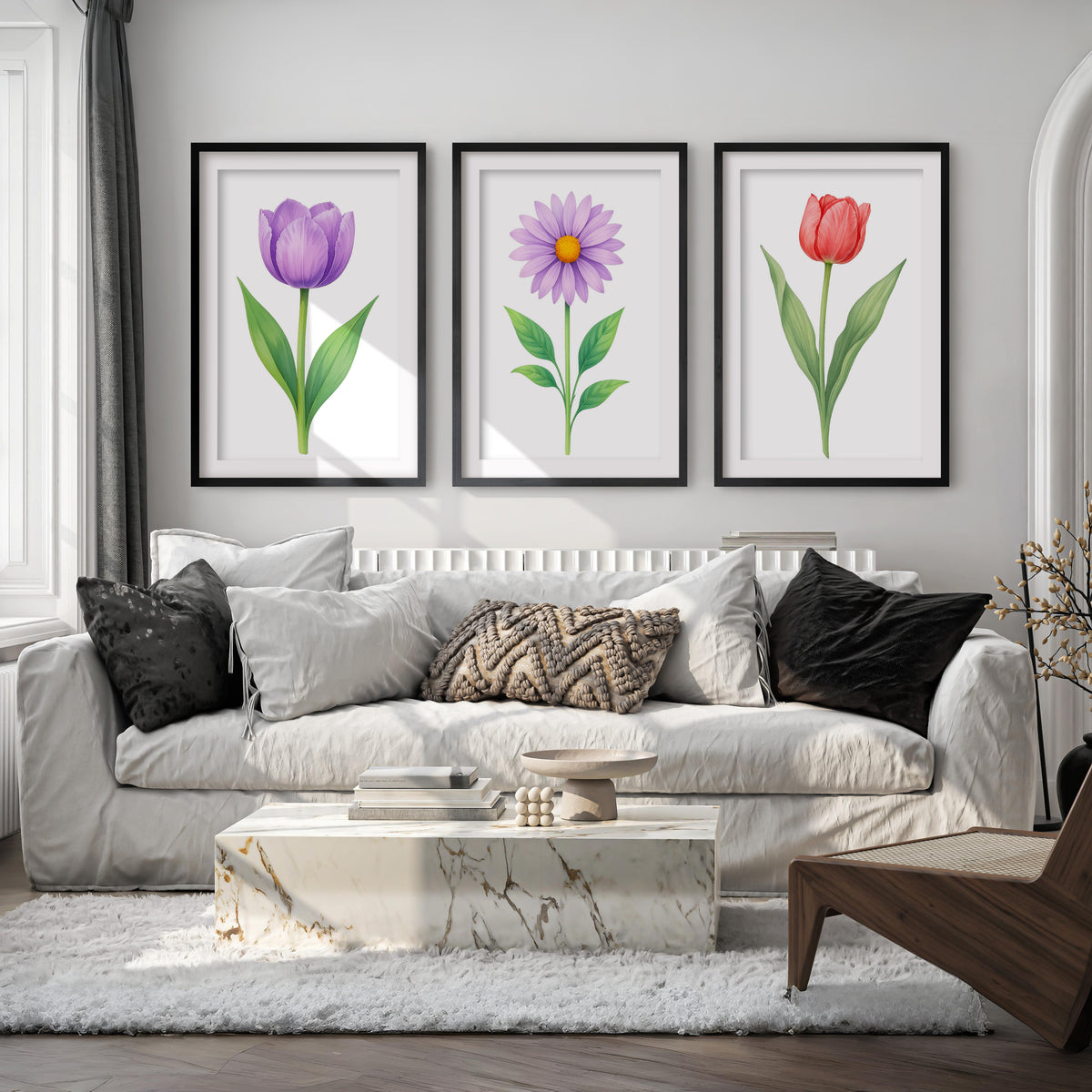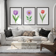 Floral Prints – Purple Tulip, Daisy and Red Tulip Botanical Prints Framed Set of 3
