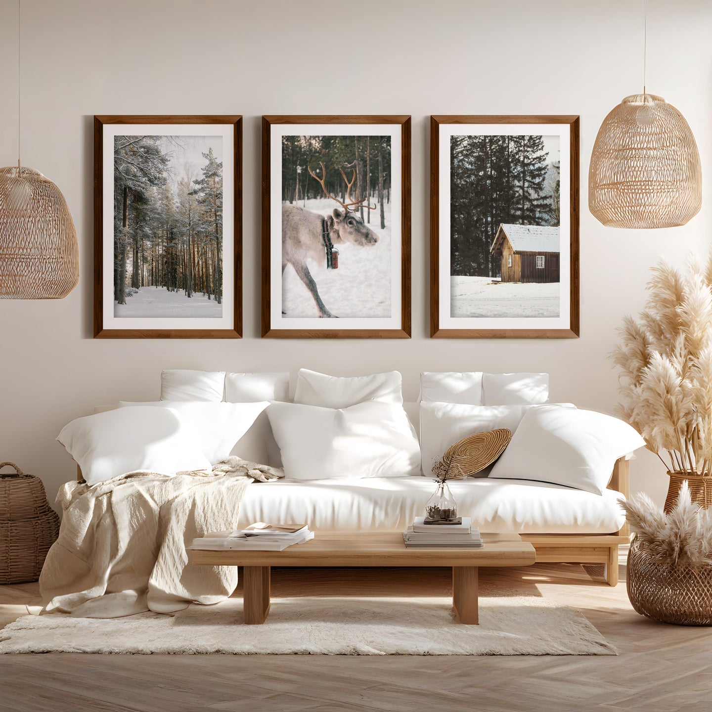 Wall Art Winter Triptych – Deer, Snowy Forest & Cabin