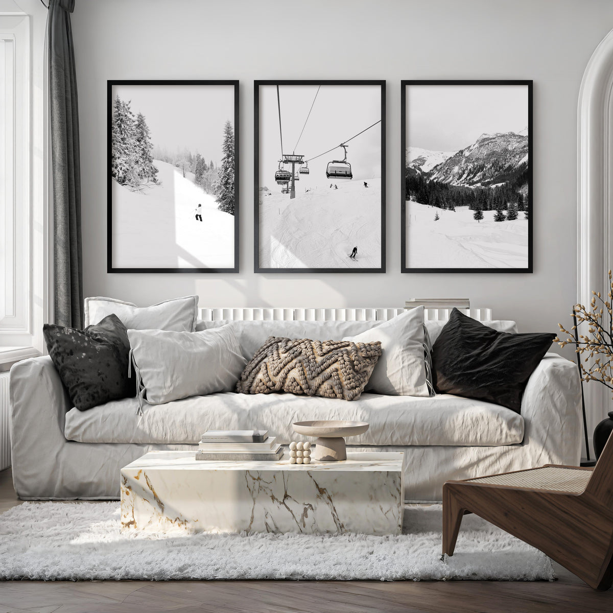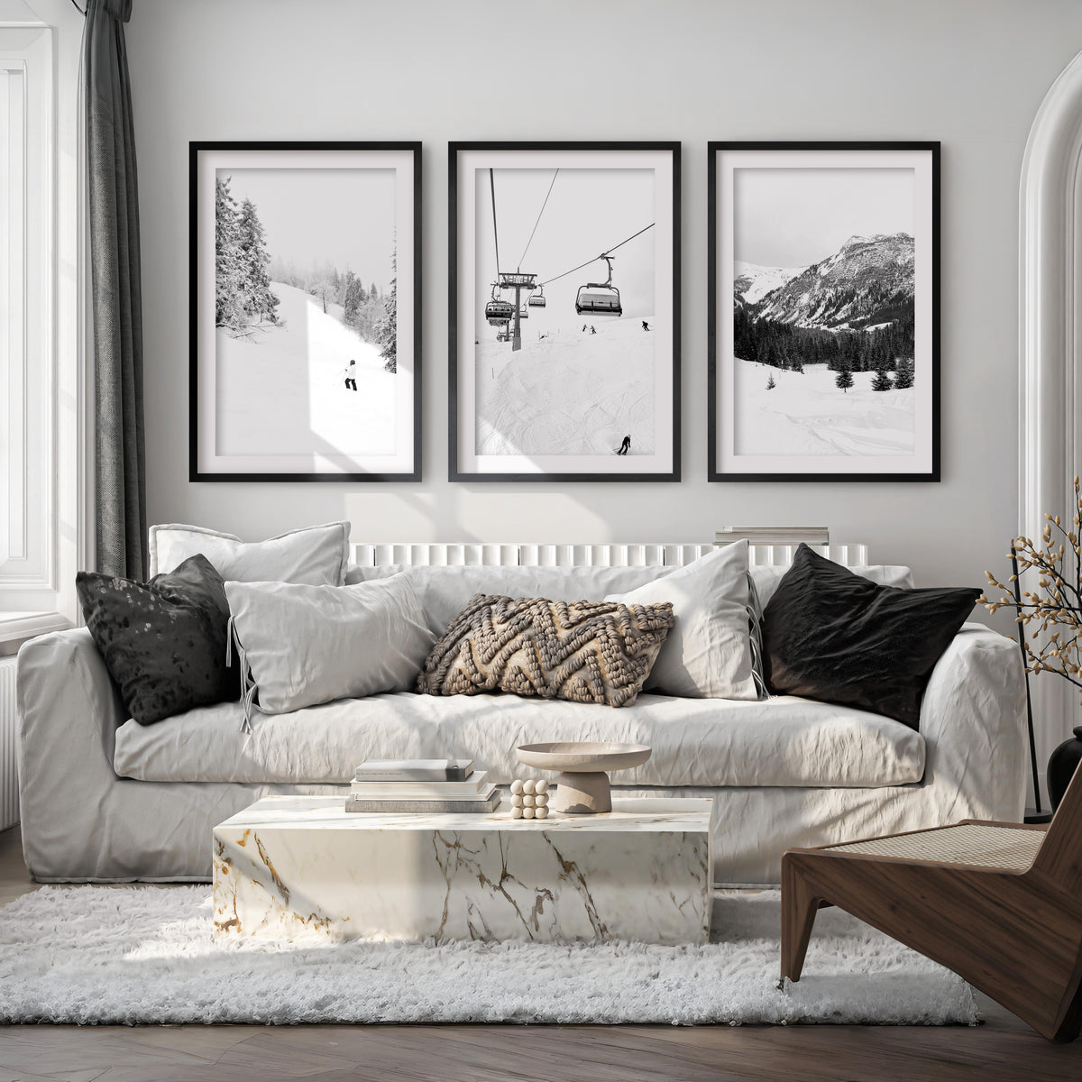 Winter Skiing Black White Wall Art. Ski Lift, Snowy Forest