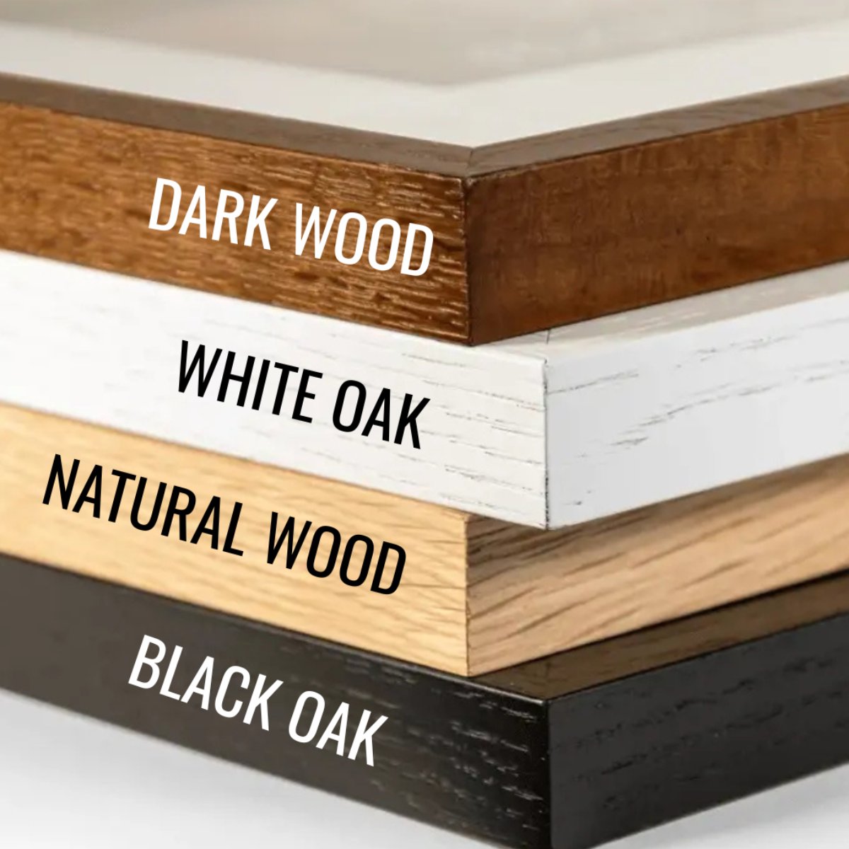 All framed prints are made in-house individually to order. We use slim natural oak profiles (0.55" wide x 0.63" deep) available in three colors: black (with visible wood grain), white (with visible wood grain), dark brown (with visible wood grain), and natural wood.