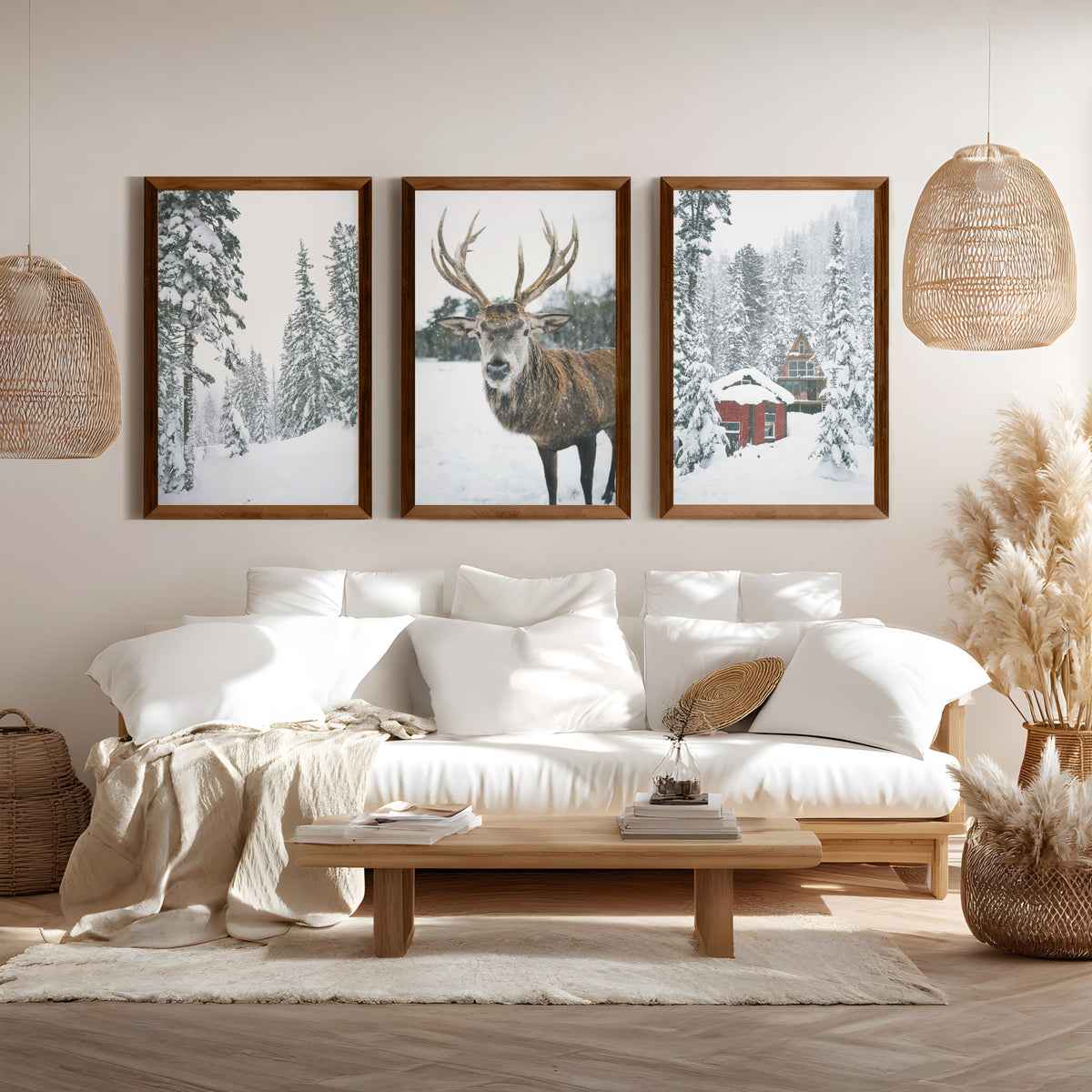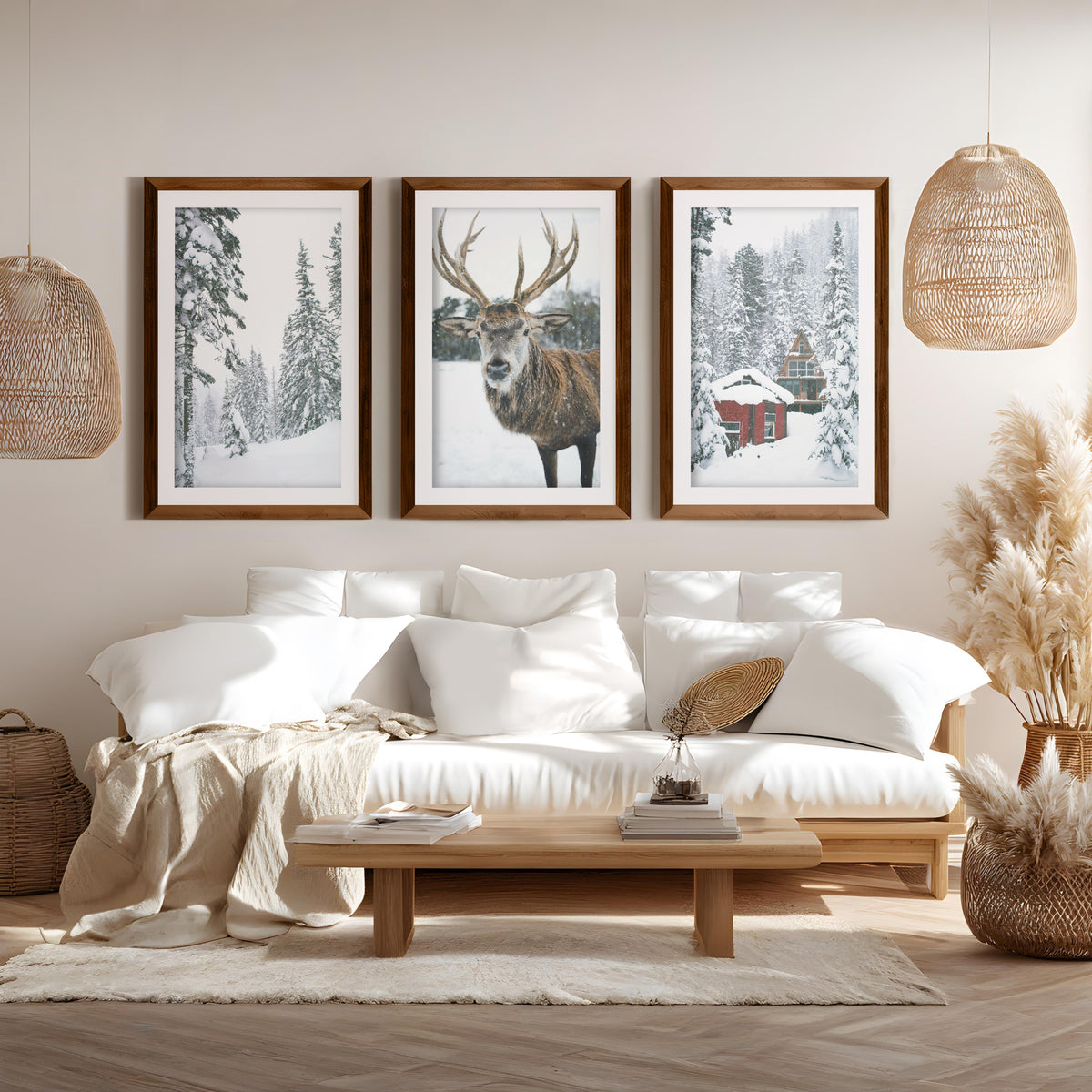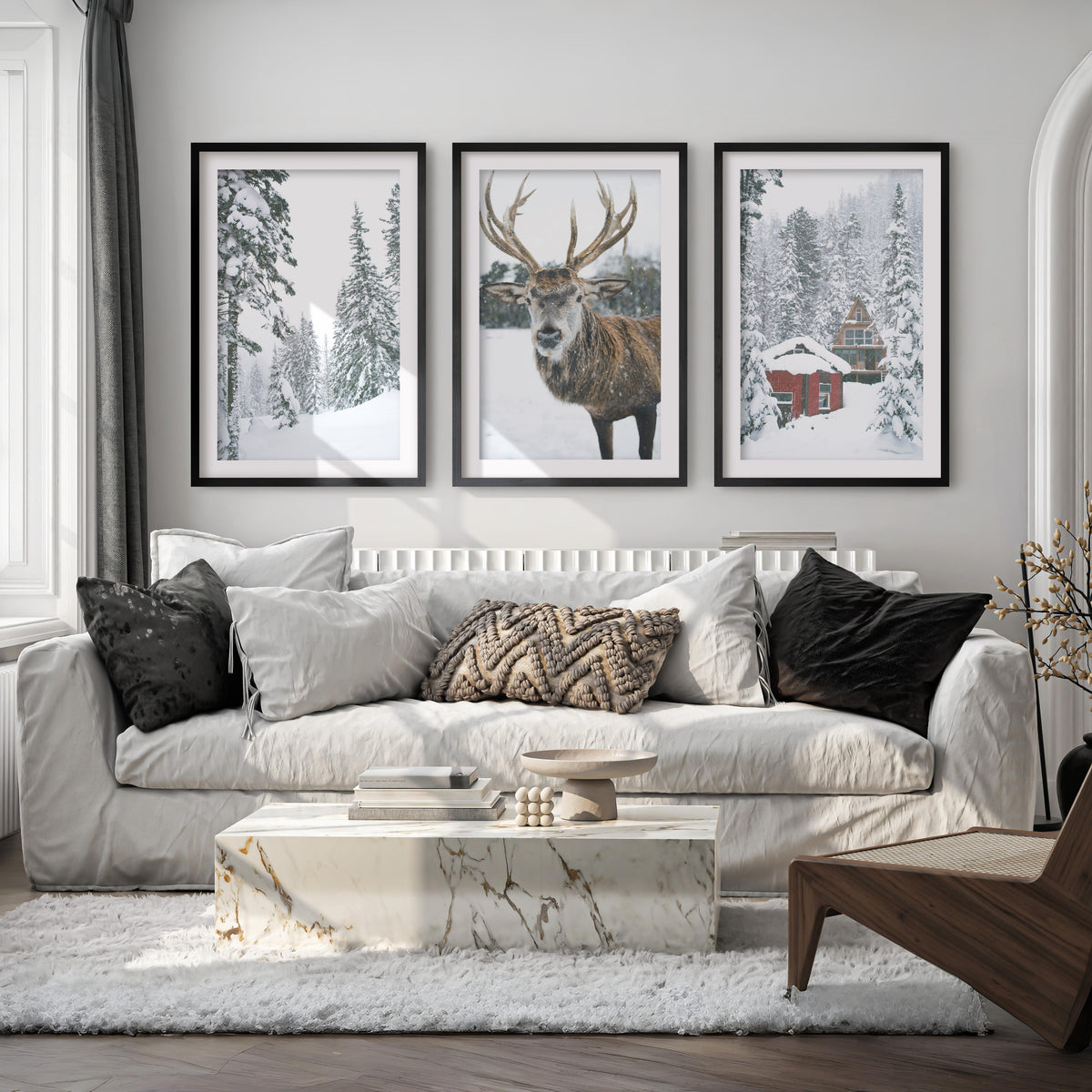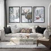Christmas Mood Wall Art Prints. Red Log Cabin, Deer
