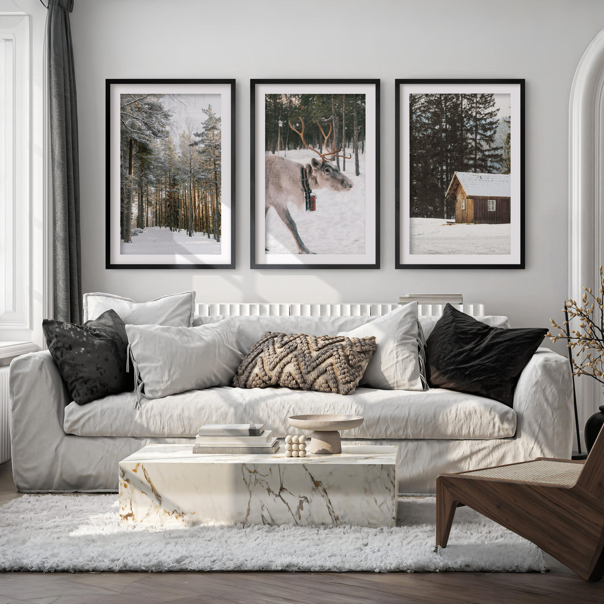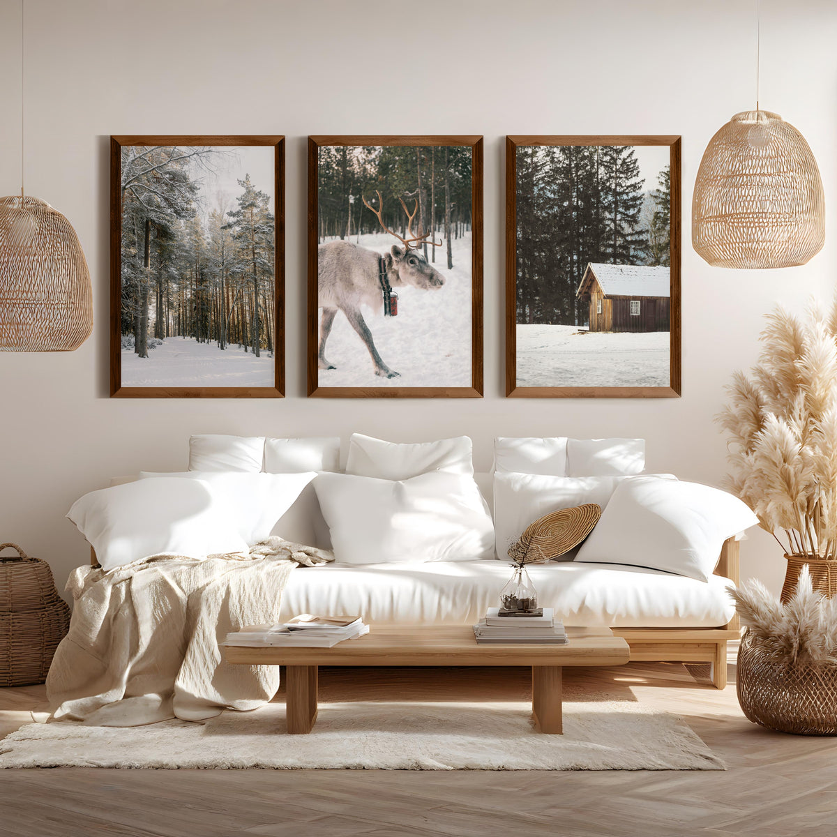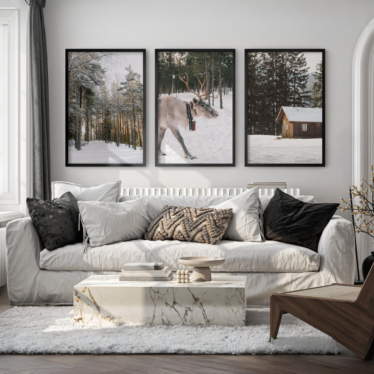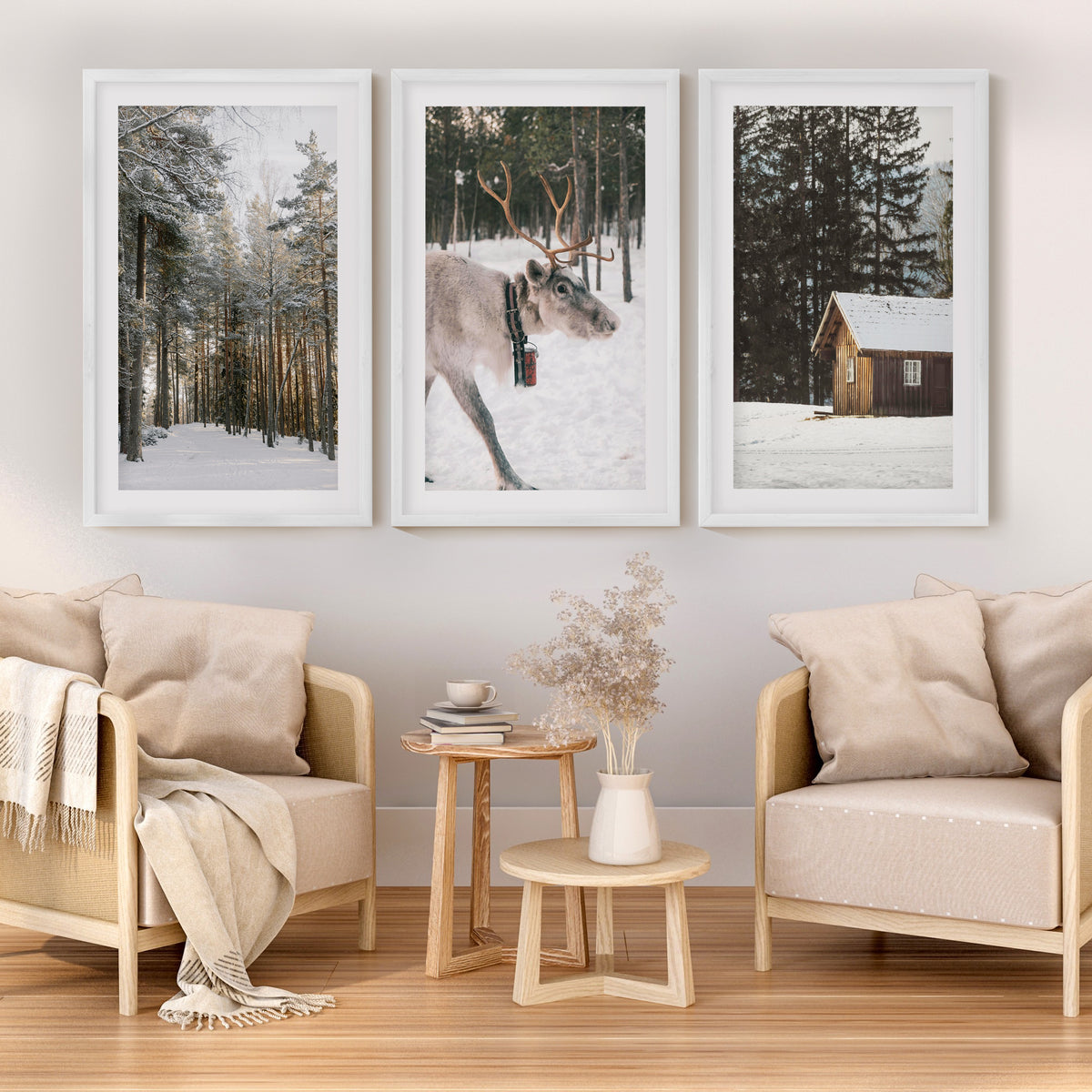 Wall Art Winter Triptych – Deer, Snowy Forest & Cabin
