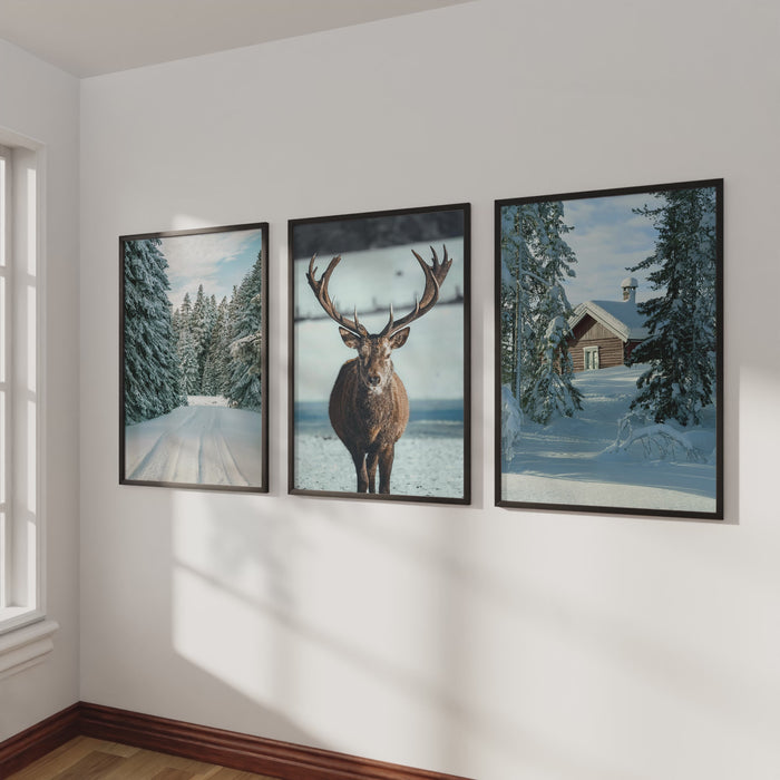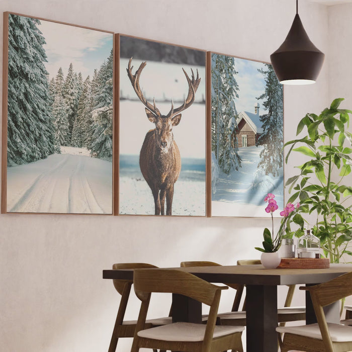 Winter Scene Wall Art – Snowy Forest, Deer & Cabin